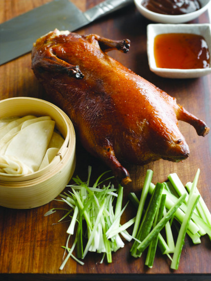 <p>Crispy duck is served with Chinese pancakes, shredded spring onions, cucumber and Hoisin sauce. Some restaurants serve this dish with Plum sauce as an alternative.</p>
