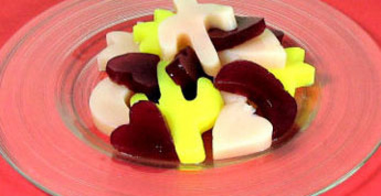 This selection of jelly has been made up with low sugar fruit juices. Suitable for children, especially if jelly is made from fresh fruit juices and grated vegetables or fruit. Some juices such as pineapple, fig, mango, peach and papaya will not set as they contain enzymes which break down the gelling ability of agar.