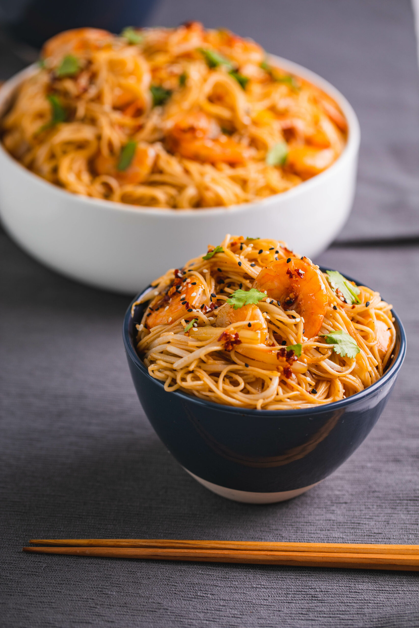 Flat rice noodles make a nice change as it is a noodle that is suitable for people with a gluten intolerance. We like the contrast in colours in this dish.
