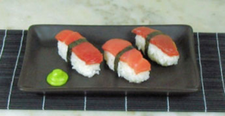 No need to roll up sushi when making this hand moulded version with tuna. When buying tuna it should be the freshest fish you can buy and of sushi quality. Eat immediately and discard any leftovers. Serve with Japanese soya sauce, which is slightly sweeter than Chinese soya sauce.
