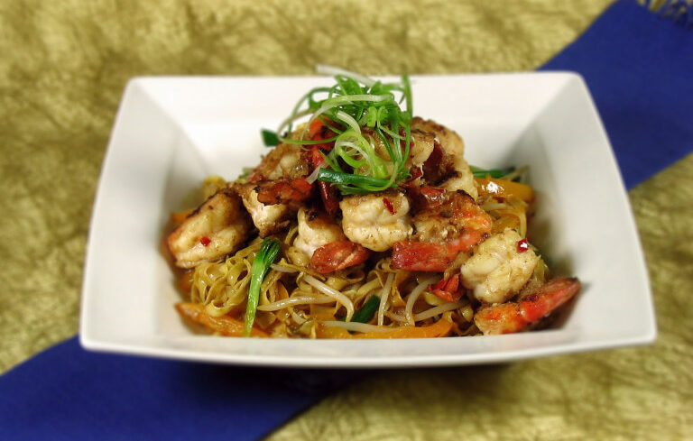 Place noodle onto a large serving platter or individual bowls and garnish with tiger prawns.