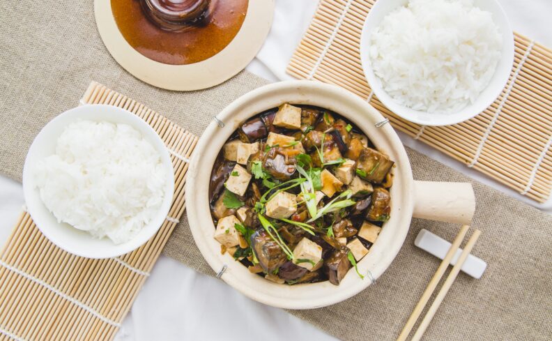 Add the steamed aubergine to the sauce and then carefully add the cubed tofu. Gently fold all the ingredients through the sauce and bring to the boil. Once boiling reduce the heat to low and simmer for 5 minutes or until the sauce has thickened and then aubergine and tofu are piping hot.
