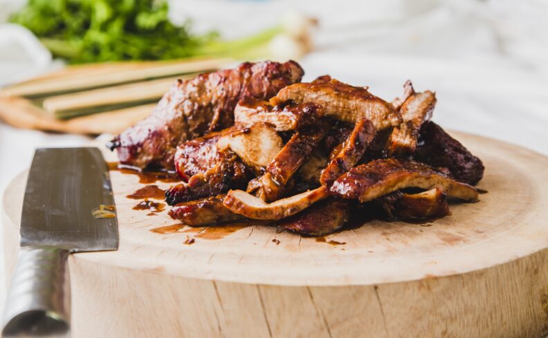 Place all the marinade ingredients into a large food bag which can be securely closed, including the pork. Ensuring that there is as little air as possible in the bag massage the marinade onto the meat and then place in the fridge overnight, or for at least 2 hours.