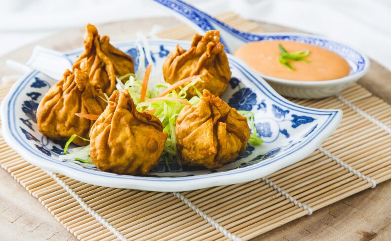 Take one wrapper at a time and place 1 tablespoon of the chicken mixture into the centre of the won ton wrapper. Dip your finger into the bowl of water and run it around along the edge of the whole wrapper. Carefully lift the whole wrapper up and hold by the filling in one hand, then using the other hand pull all the sides and edges up around the filling together and pinch just above the filling tightly to form a ‘money bag’ shape. Make sure that the dumpling is tightly sealed.