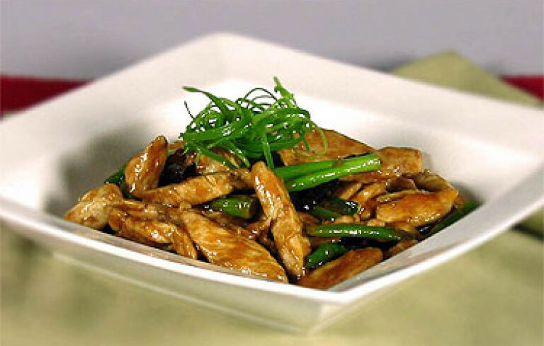 Cut chicken into fine slices approximately 6mm thick and season as above.