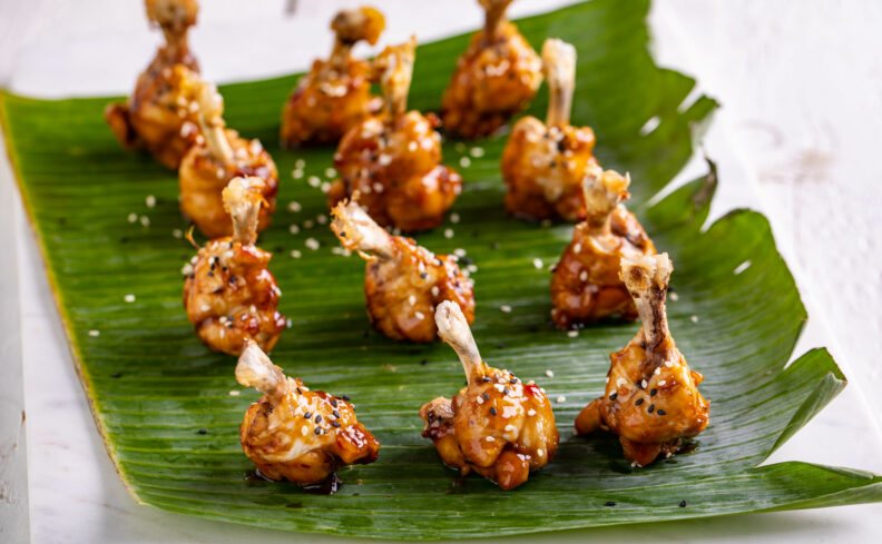 Once the chicken wings have rested and cooled slightly, using a brush glaze the chicken wings with the sweet chilli sauce. Garnish with the sesame seeds and serve.