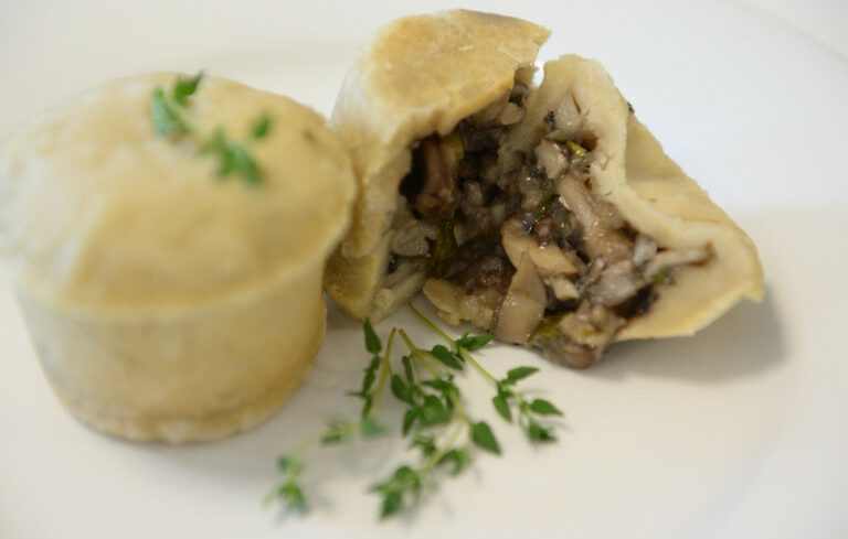 5. Divide the mushroom mix between the two bowls. Divide the remaining pastry in two and roll out to make lids. Wet the pastry, which overlaps the top of the bowls, and press the lids firmly onto the bowls. Trim off the excess pastry.