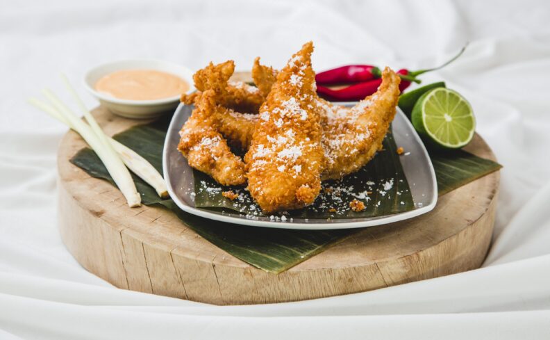 Carefully cook 2-3 pieces of chicken at a time, ensuring not to over-crowd the pan. Turn the chicken over during cooking and these should take 5-6 minutes to cook. Remove from the pan and place onto clean kitchen paper to drain any excess oil. Sprinkle over some of the remaining desiccated coconut at this point.