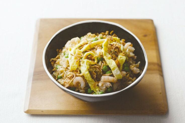 Season to tase and then spoon onto a large platter and garnish with omelette strips and crispy onions.