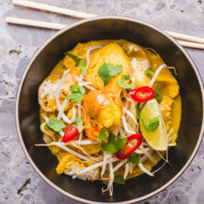 Bring to the boil and cook for approximately 2 minutes, until the coconut milk takes on a light sheen.