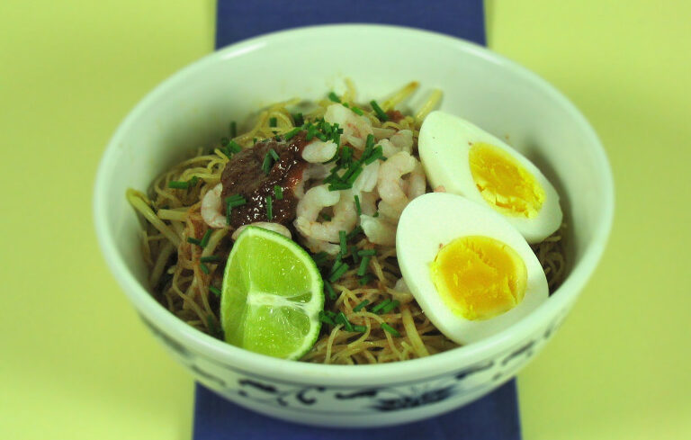 Garnish with prawns, hard boiled egg, snipped chives and a lime wedge.