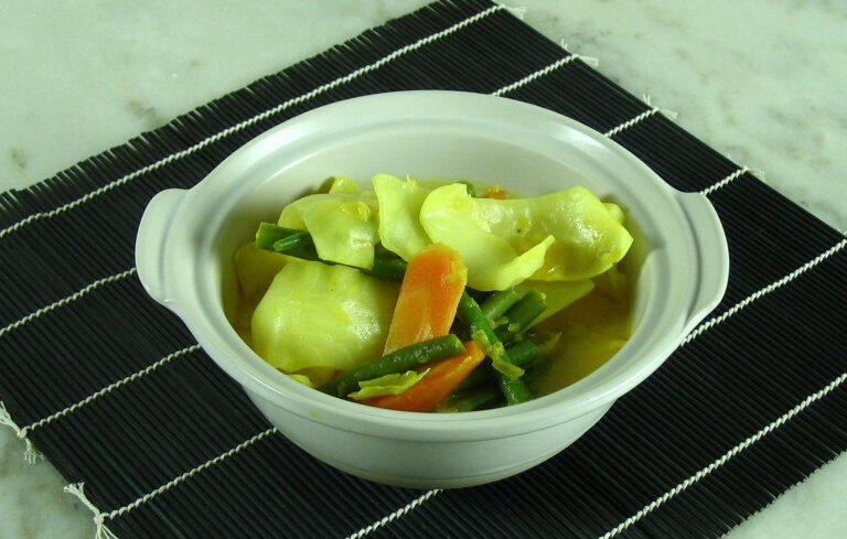 Then add coconut milk, white cabbage, beans and stock cube, simmer for approximately 5 minutes.