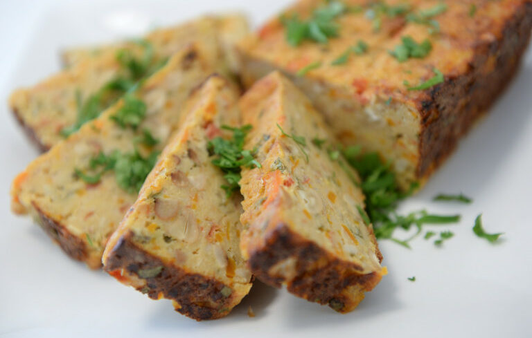 7. Leave to cool inside the tin for 10 minutes before trying to remove it. Slice and serve with vegetables