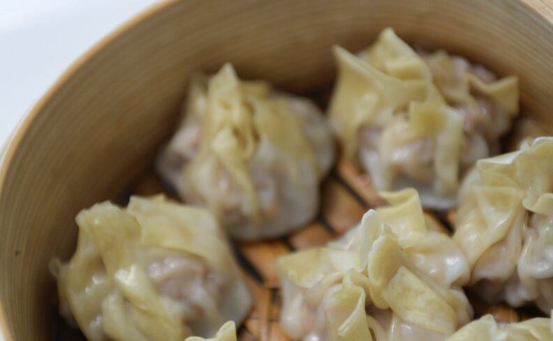 Peel off a wonton wrapper and, with a pastry brush, lightly brush round the outside with cold water. Place 1 tsp of mixture in the centre and scrunch up into a pouch, squeezing to seal. Do not overfill. Repeat until you have around 35-40. (These can be chilled for up to 1 hr on a tray lined with baking parchment.) Keep the wonton wrappers covered at all times to prevent them from drying out.
