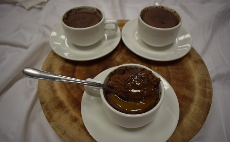 Put all the mixture into a mug and ensure that it does not fill more than half of the mug. Add the caramel sauce ensuring that the caramel sauce is cold and lightly press into the mixture.