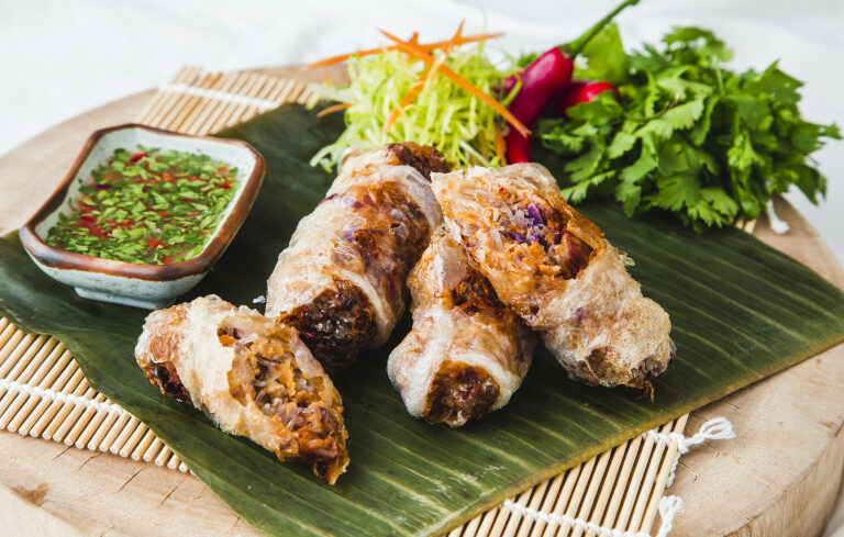 11. Serve the spring rolls with the dipping sauce and a small garnish of finely shredded lettuce and carrot.