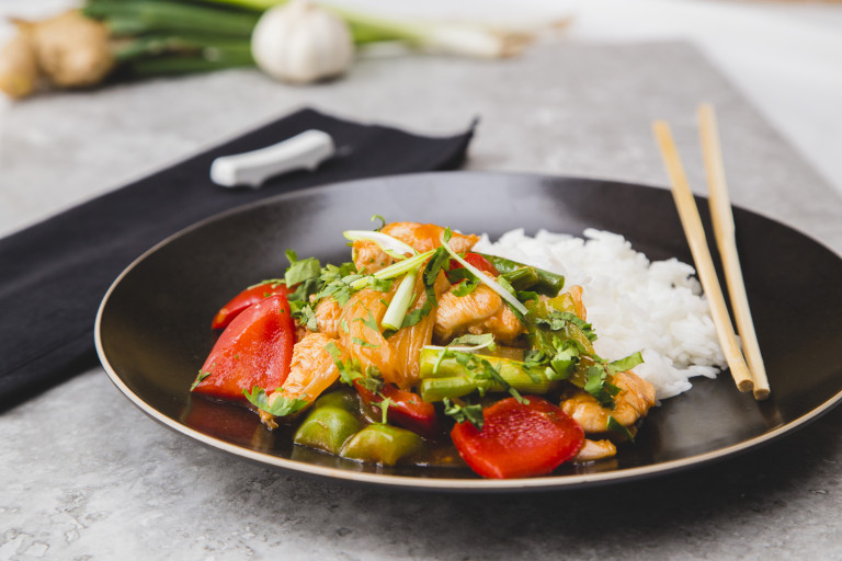 Here a familiar favourite is given an oriental twist with delightful results. This exotic salad dressing marries well with another favourite, salmon, which can be eaten hot or cold.